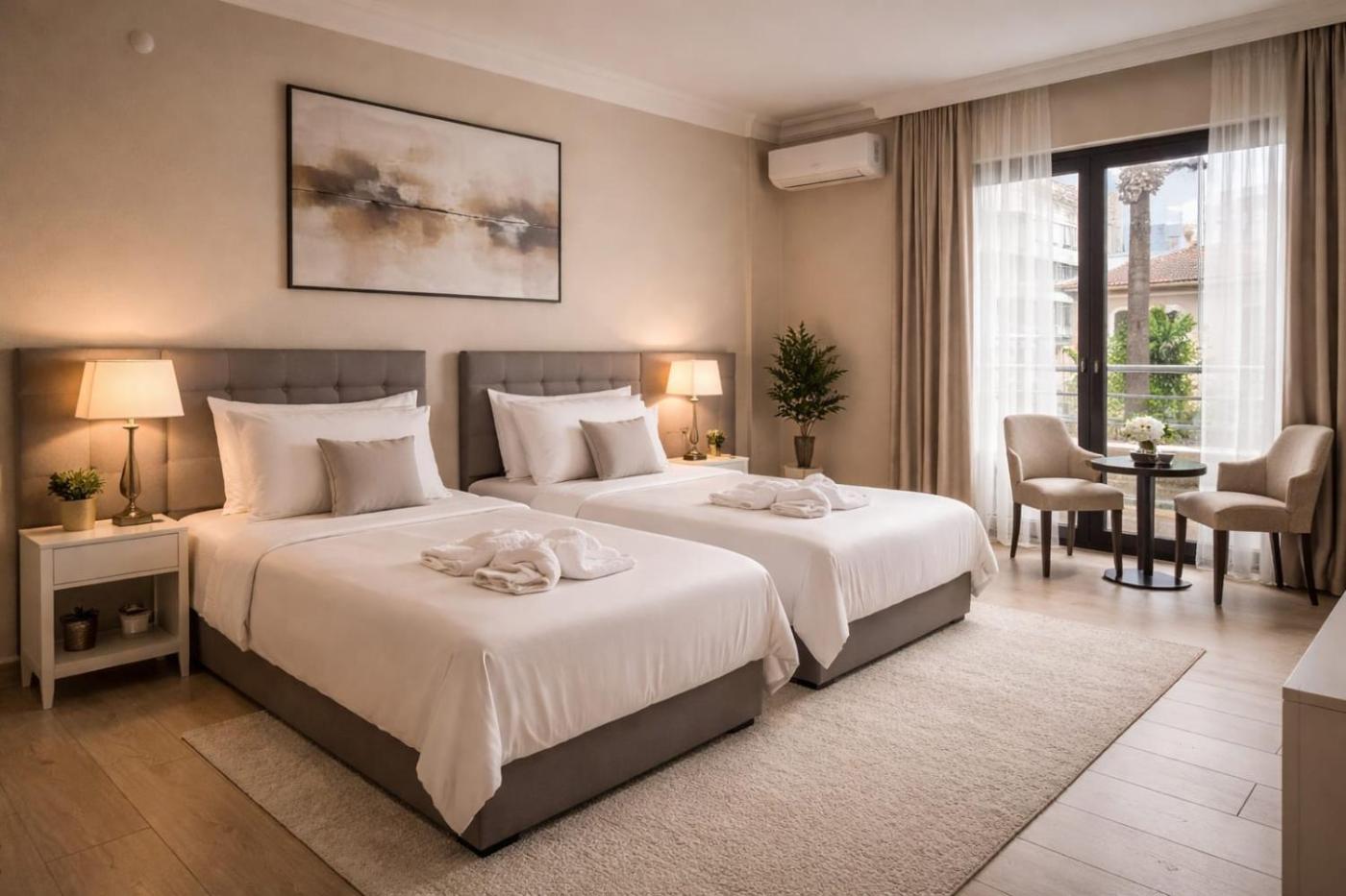 Budget Twin Room. Providing free toiletries, this twin room includes a private bathroom with a shower, a hairdryer and slippers. The air-conditioned twin room provides a flat-screen TV with satellite channels, soundproof walls, a tea and coffee maker, a tiled floor as well as ancourtyard view. The unit offers 2 beds.
